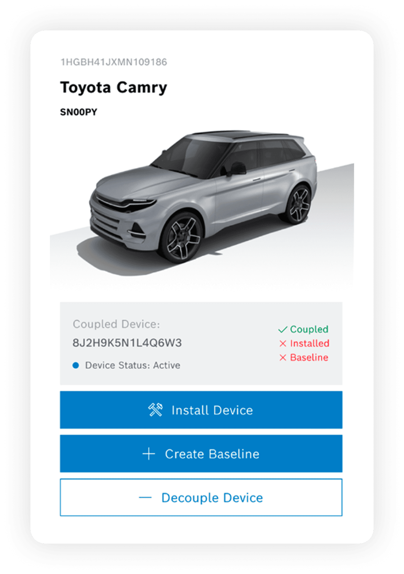 This design shows the paired vehicle, a major improvement for mass installations and for helping installers locate the correct vehicle. It also surfaces step progress, device status, and installation instructions when needed. This represents the end goal of what we wanted installers to have access to.