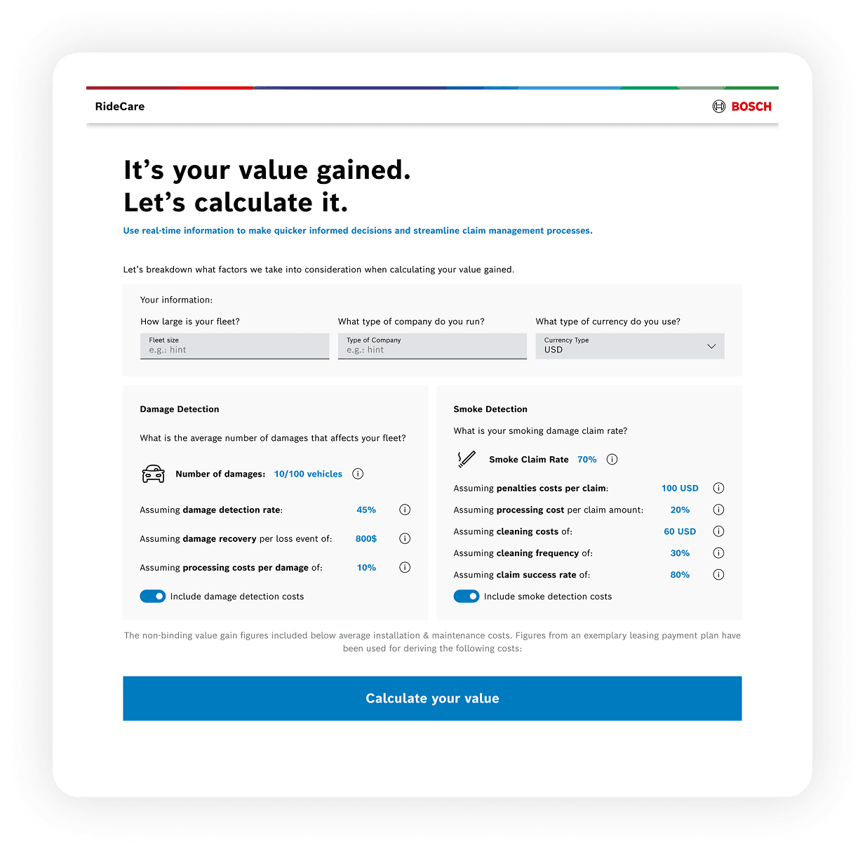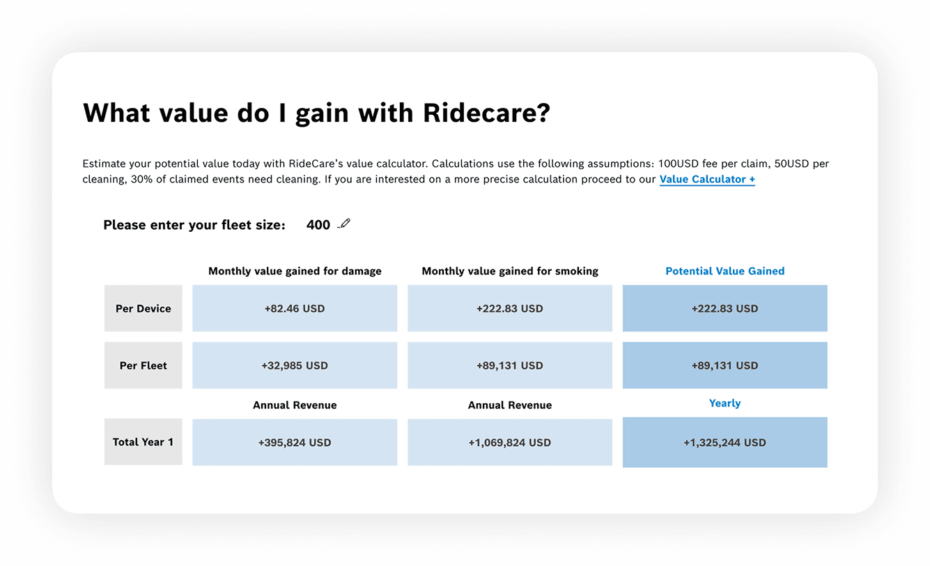 To communicate value more clearly, I designed a simplified calculator that dynamically reflects monthly revenue from damage and smoke detection based on fleet size. Future enhancements could include expanded metrics and long-term value projections.