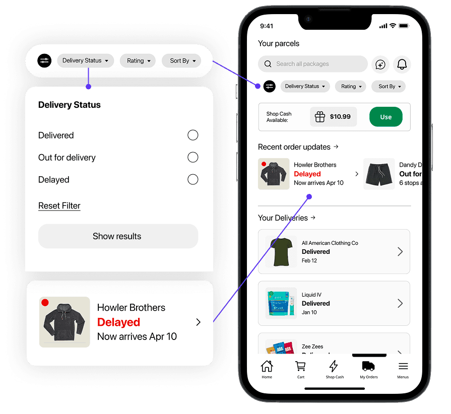 The redesign improves order clarity by visually distinguishing shipment status and adds filtering and search to give users greater control over their order history.