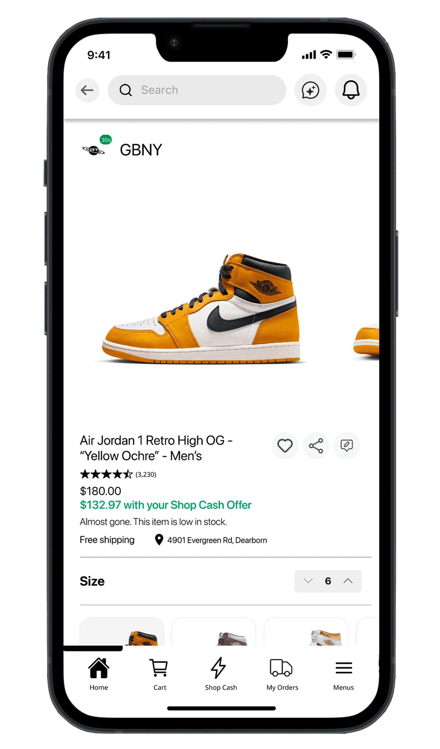 This prototype has limited functionality, but feel free to explore. To experience the purchase flow, search for the Air Jordan 1 Retro High Men’s shoe, or try the guided walkthrough to learn more about Shop Cash.