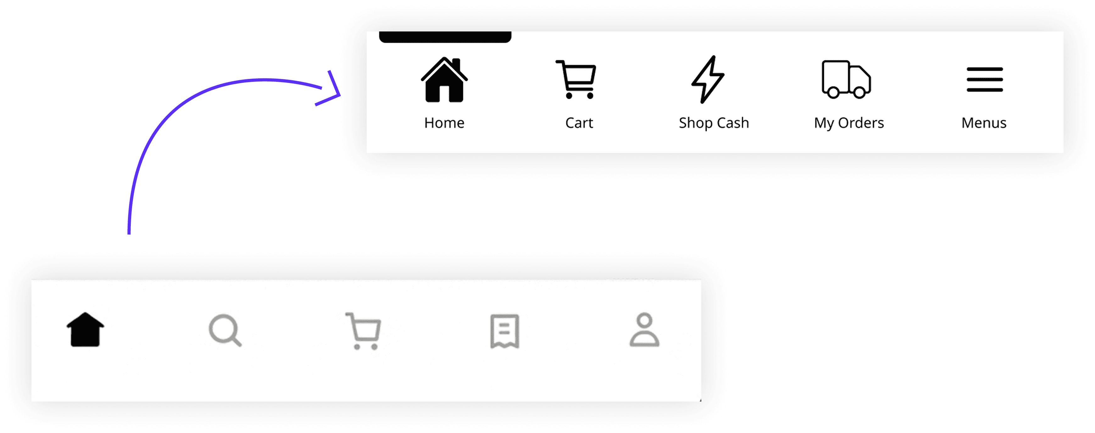 The navigation design hindered discoverability of Shop Cash and account details due to limited exposure and ambiguous iconography.